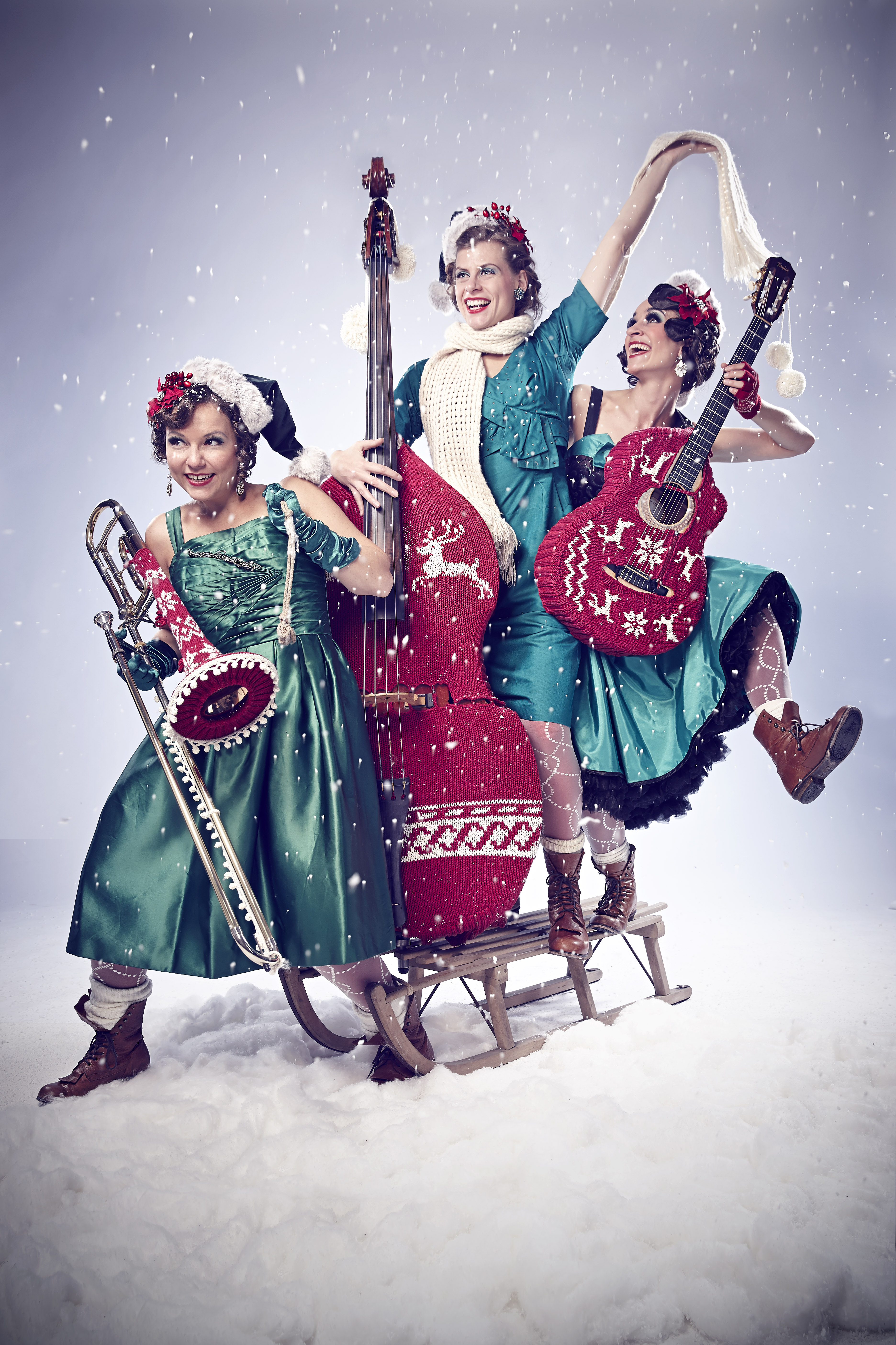 Zucchini Sistaz, Drei Frauen mit Posaune, Kontrabass, Gitarre auf einer Bühne. Alle Instrumente sind weihnachtslich eingestrickt. Im Hintergrund Weihnachtsbäume und Sterne. Die Frauen winken in die Kamera.