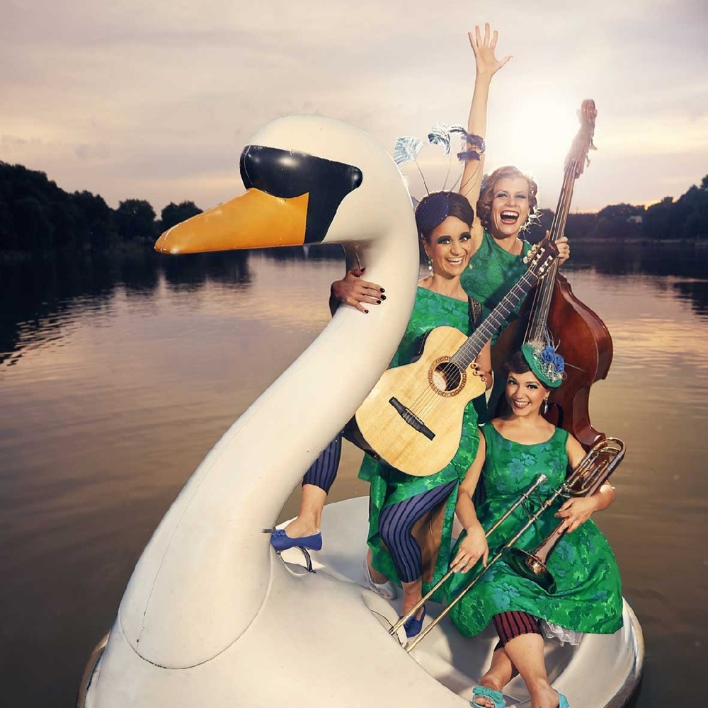 Ihre Qualität und Bühnenpräsenz haben sie auch auf Tourneen mit Größen wie Götz Alsmann, der SWR Big Band, den Geschwistern Pfister oder Gerburg Jahnke unter Beweis gestellt. Rund 100 Auftritte jährlich und eine stetig wachsende Fangemeinde sprechen für sich: Das detailverliebte Gesamtkunstwerk ZUCCHINI SISTAZ überzeugt auf ganzer Linie. Und dabei zaubern sie ihrem Publikum stets ein Strahlen in die Augen und ein Lächeln ins Gesicht … Die ZUCCHINI SISTAZ sind: Tina Werzinger – Gesang, Gitarre, Ukulele Jule Balandat – Gesang, Kontrabass Sinje Schnittker – Gesang, Trompete. Posaune, Flügelhorn, Akkordeon, Klarinette, Xylophon u. v. m.